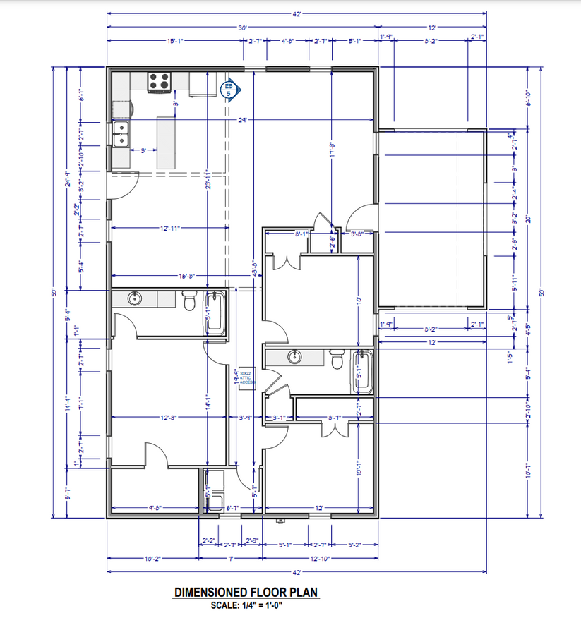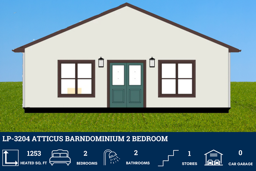 Introducing the PL-3204 Atticus Barndominium House Plan, a perfect choice for first-time homeowners. With two bedrooms, two bathrooms, and 1,253 heated sq ft, this open-concept barndominium floor plan creates a spacious feel for cozy living.