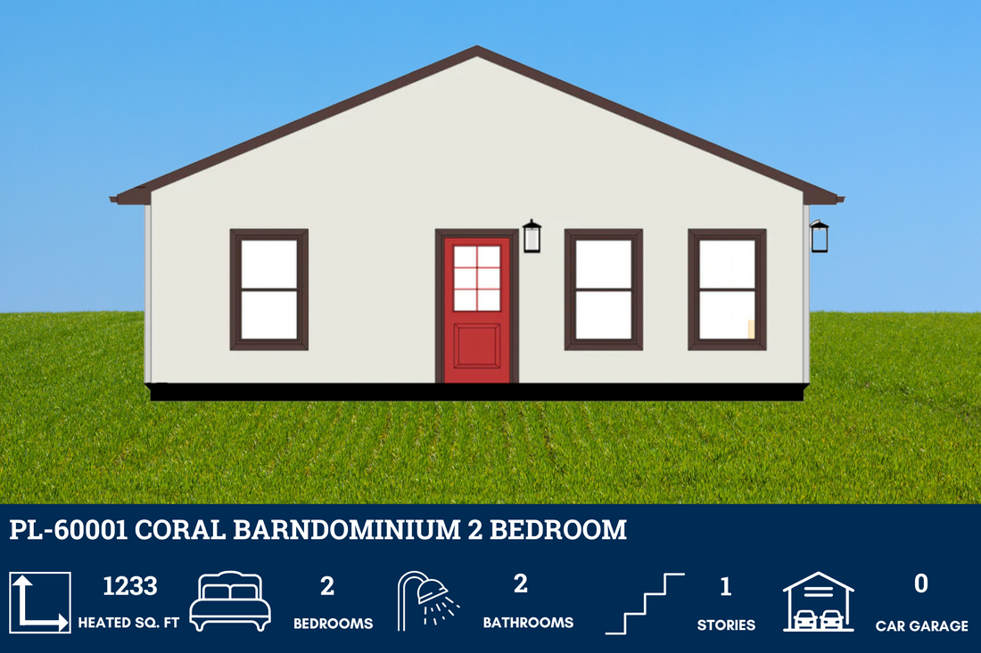Meet the PL-60001 Coral Barndominium House Plan. This 1,233 sq ft gem offers two bedrooms and two bathrooms, just like the Atticus barndominium. Open-concept barndominium floor plans such as these create an inviting atmosphere for versatile use.