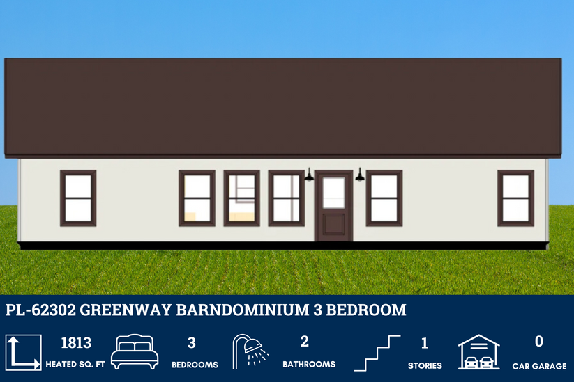 Behold the PL-62302 Greenway Barndominium House Plan. Spanning 1,813 heated sq ft with three bedrooms and two bathrooms, there is plenty of space for the whole family.