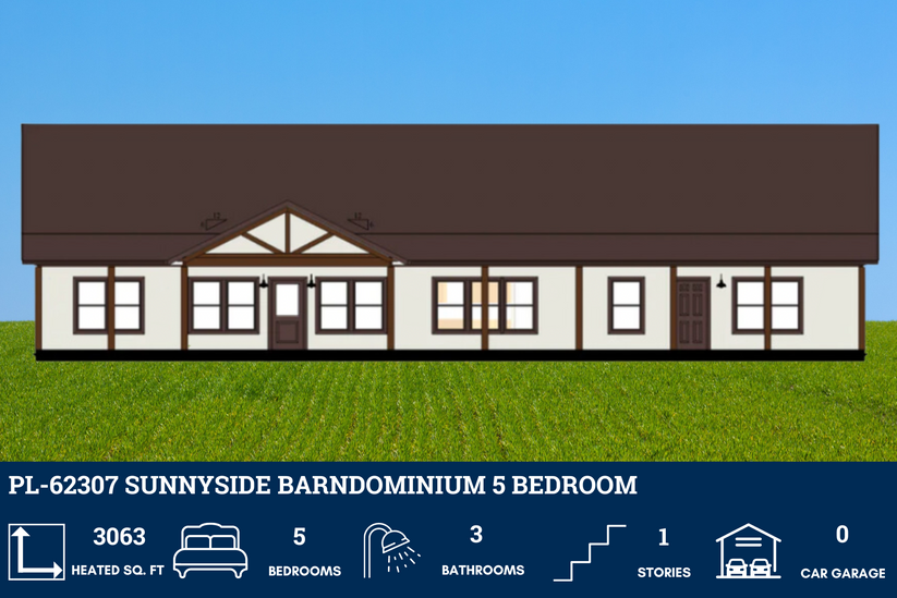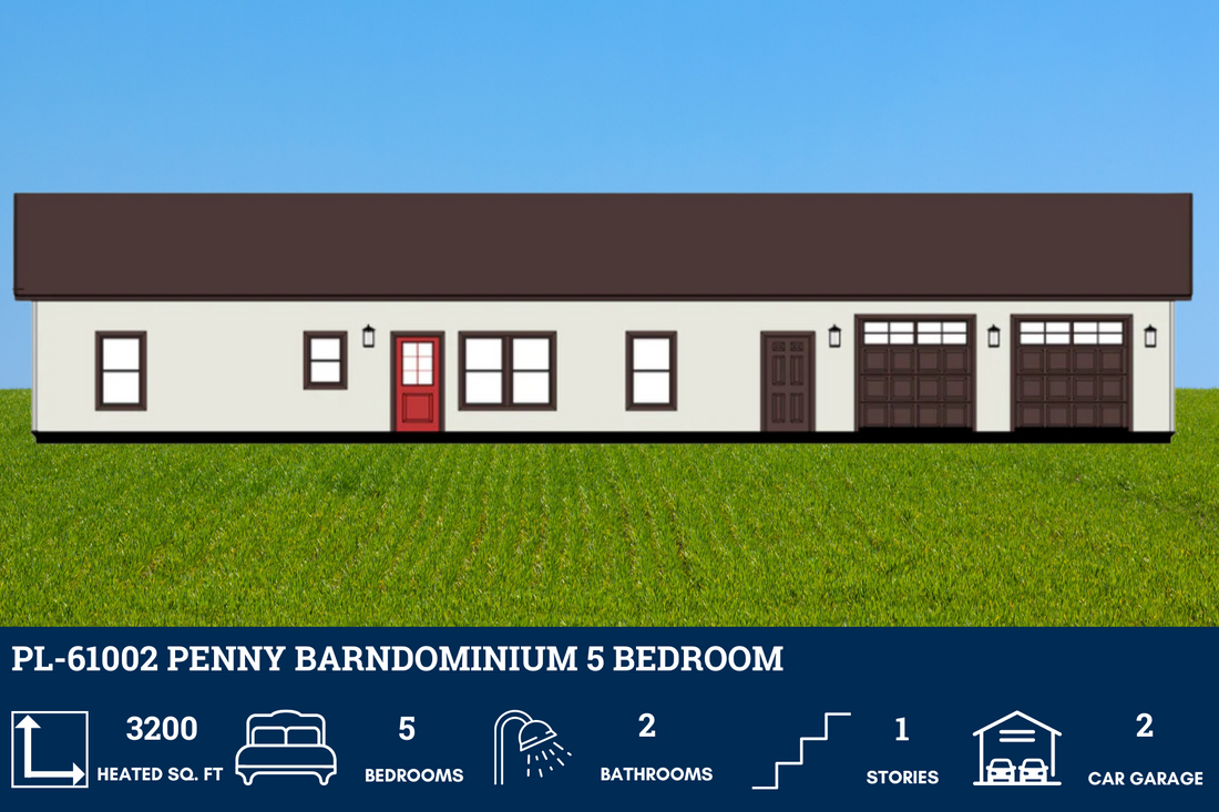 The PL-61002 Penny Barndominium House Plan, spanning 3,200 heated sq ft, features five bedrooms and two bathrooms, accompanied by an attached 1,200 square foot garage.
