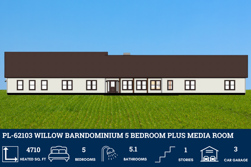 The PL-62103 Willow Barndominium House Plan is an expansive retreat, boasting 4,710 heated sq ft. With five bedrooms, five full baths, and one half bathroom, this barndominium provides the ultimate comfort. The attached 1,327 sq ft four-car garage adds both convenience and functionality.