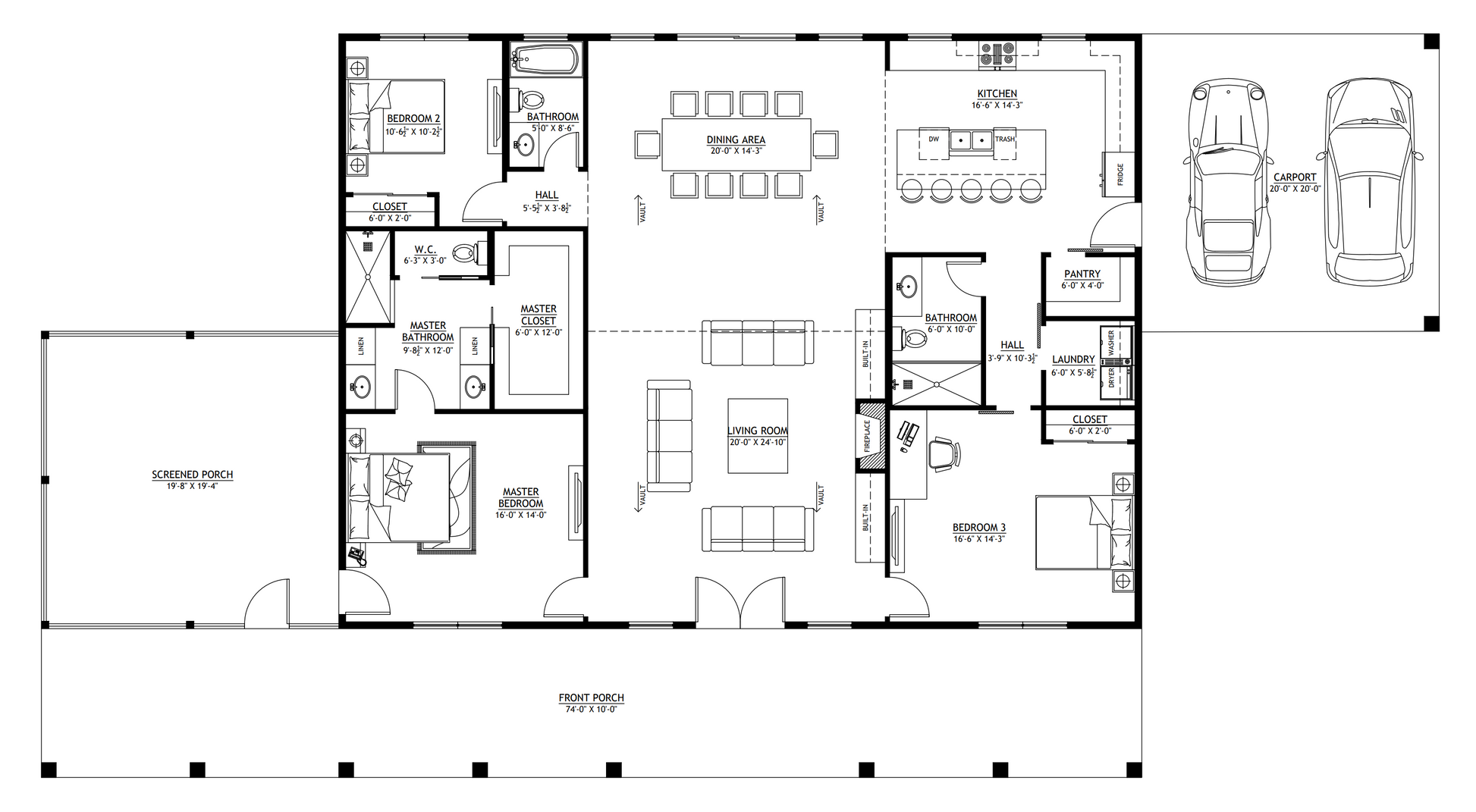 Carport 400 SF, Front porch 740 SF, Screened porch 400 SF = TOTAL 1,540 SF