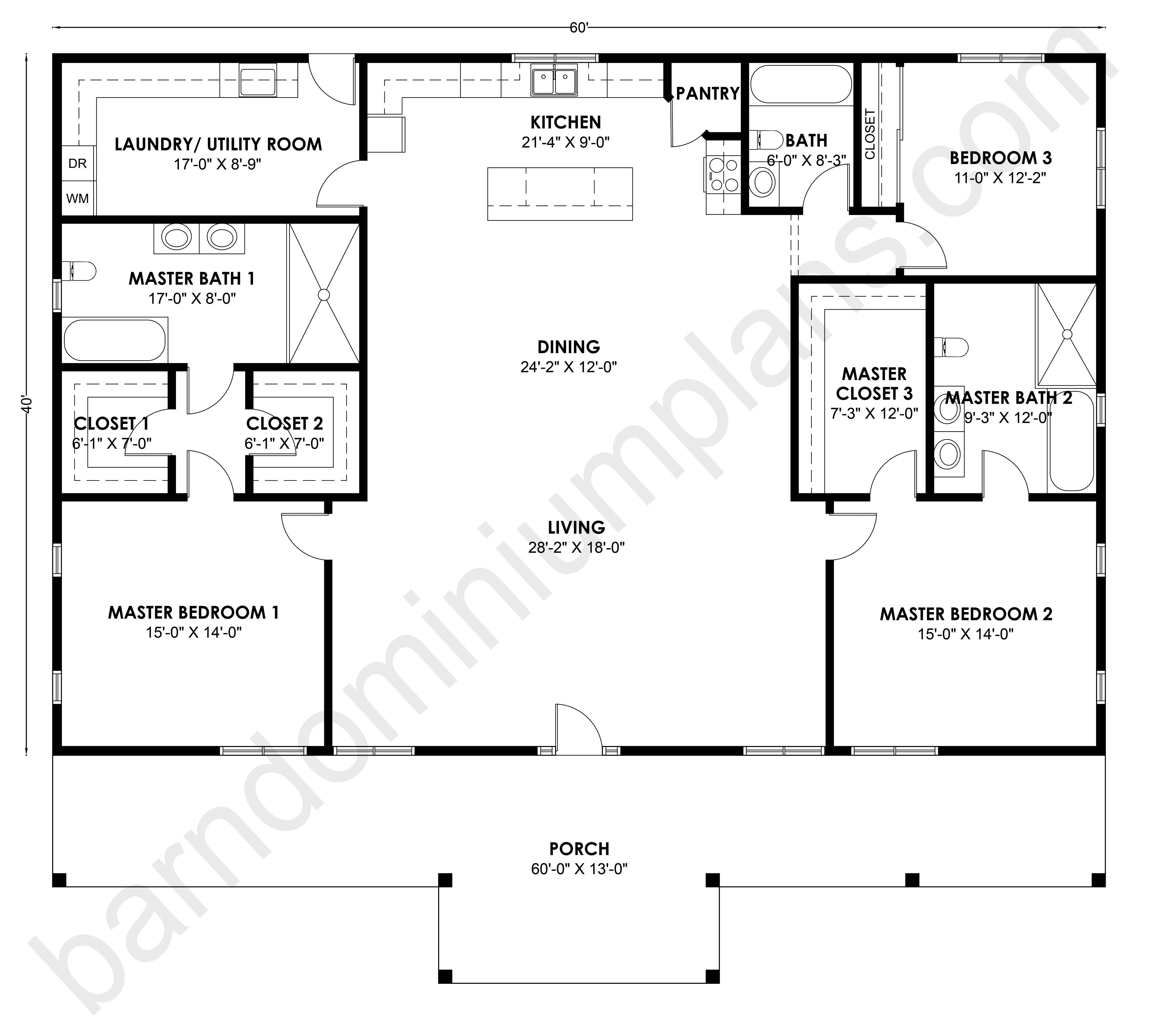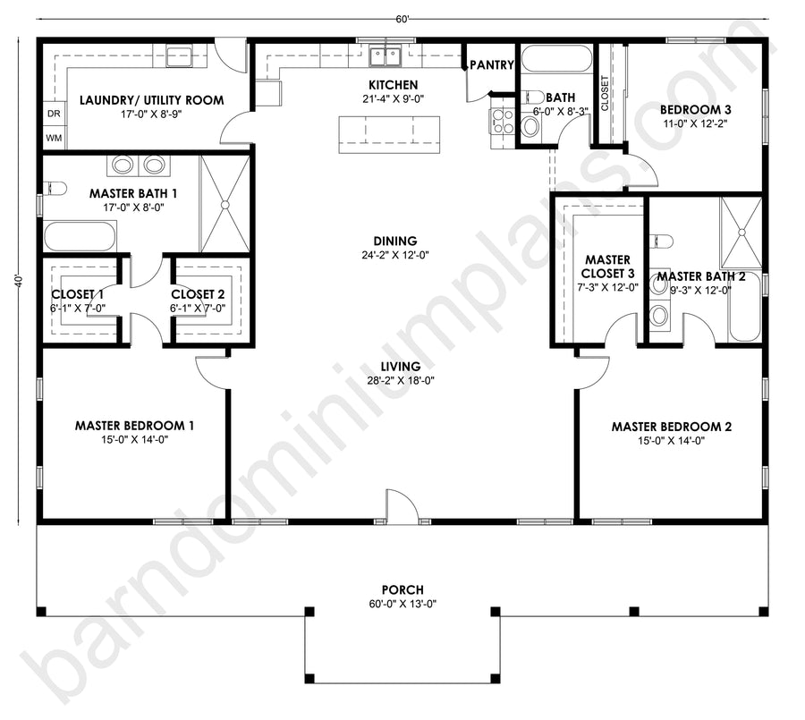 The design prioritizes utility with a large 17'-0" x 8'-9" laundry room and an expansive 60'-0" x 13'-0" front porch for outdoor living.