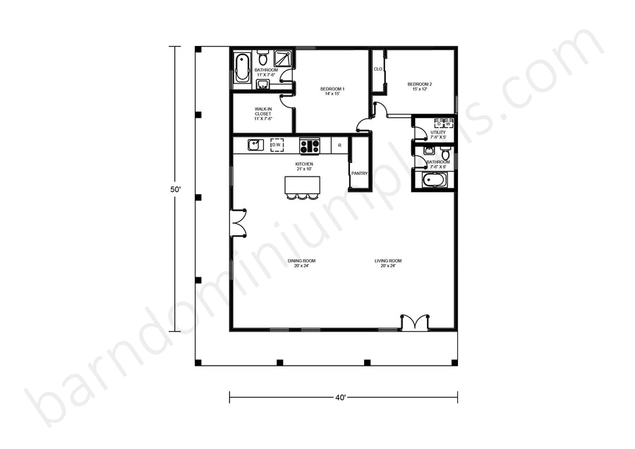 - This floor plan presents a spacious 40′ x 50′ barndominium design, emphasizing open living and comfortable private spaces.