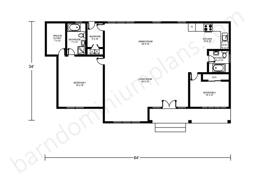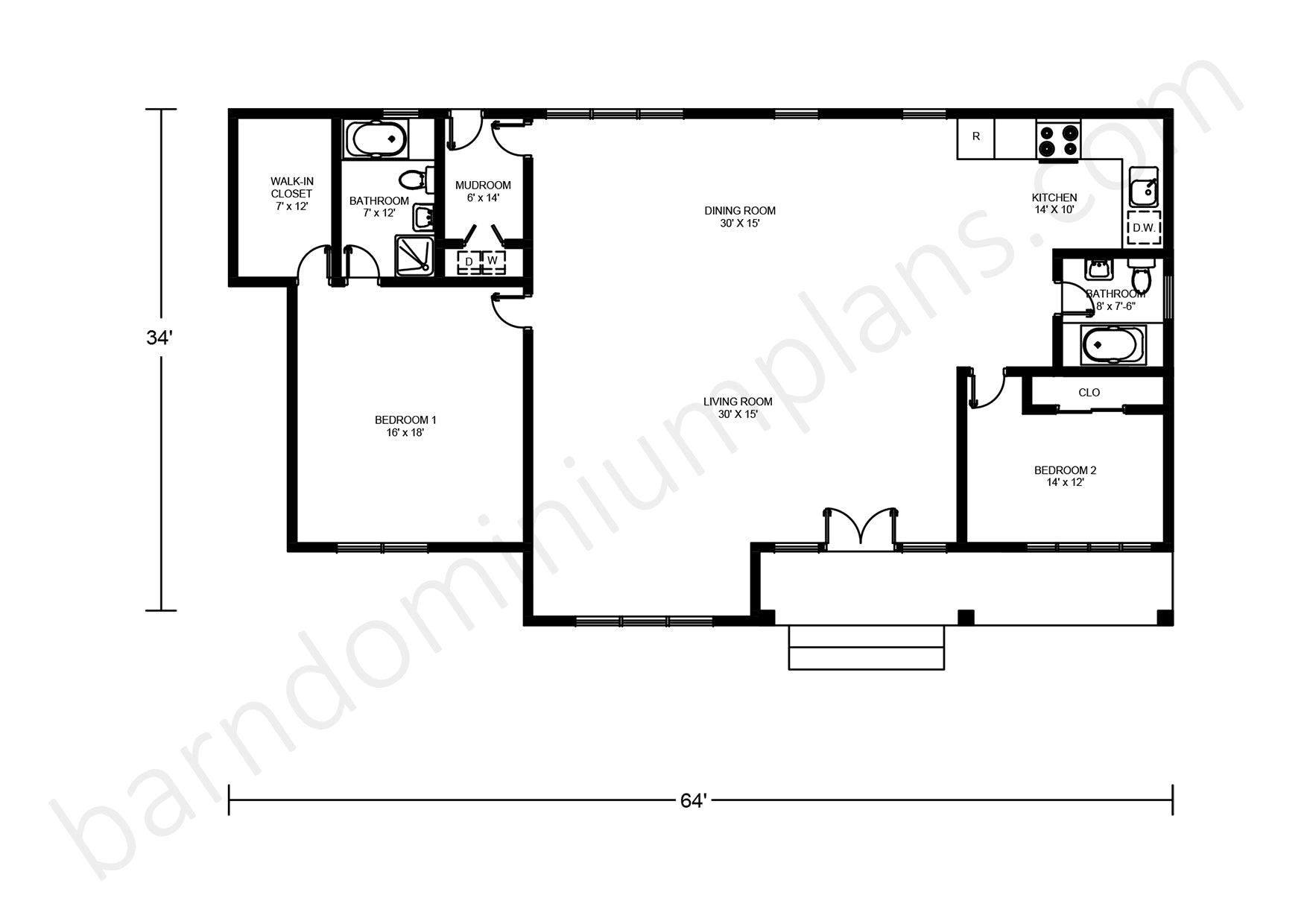 - This floor plan presents a 64′ x 34′ barndominium design featuring two bedrooms and two bathrooms.