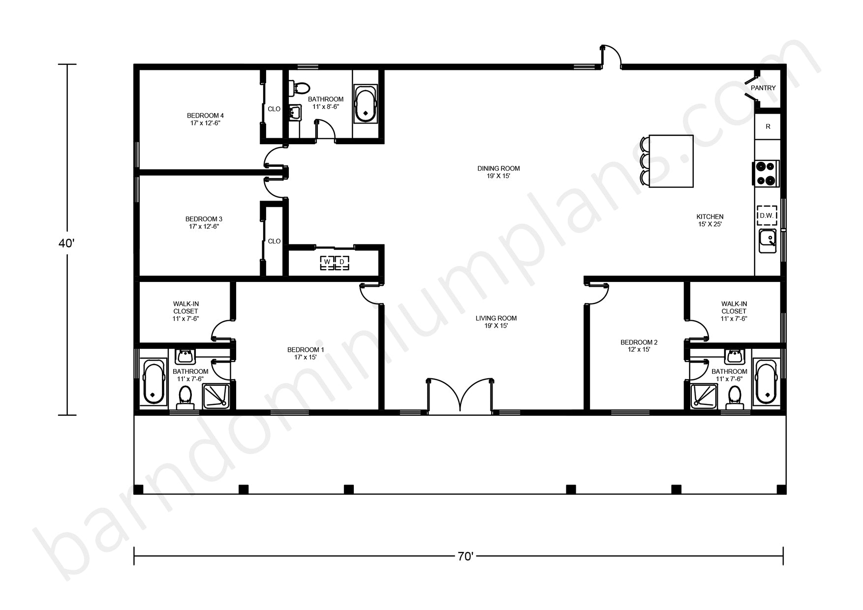 - This spacious single-story home, BCO-40066, encompasses 2800 square feet, with overall dimensions of 70 feet in length and 40 feet in width.