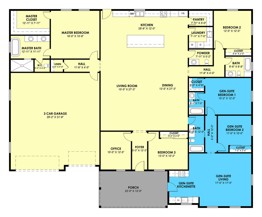 - A fully integrated generational suite featuring its own living room, kitchenette, two bedrooms, and dedicated bathrooms—perfect for extended family, guests, or independent living within the home.