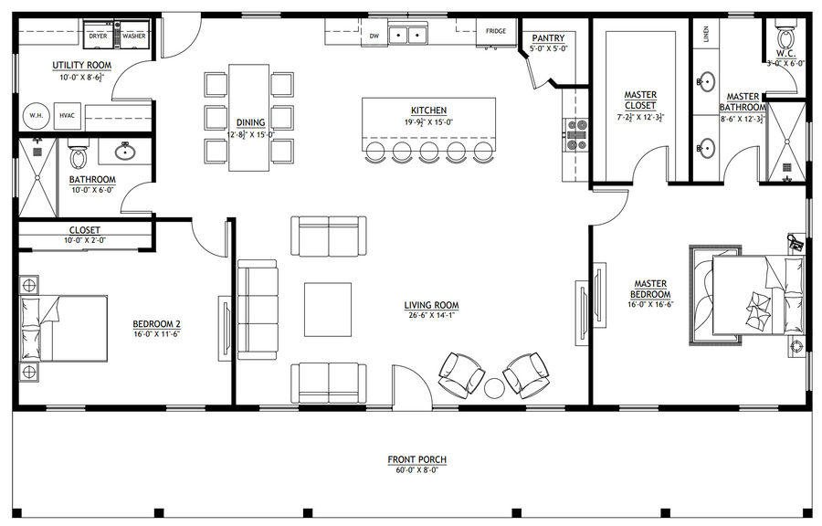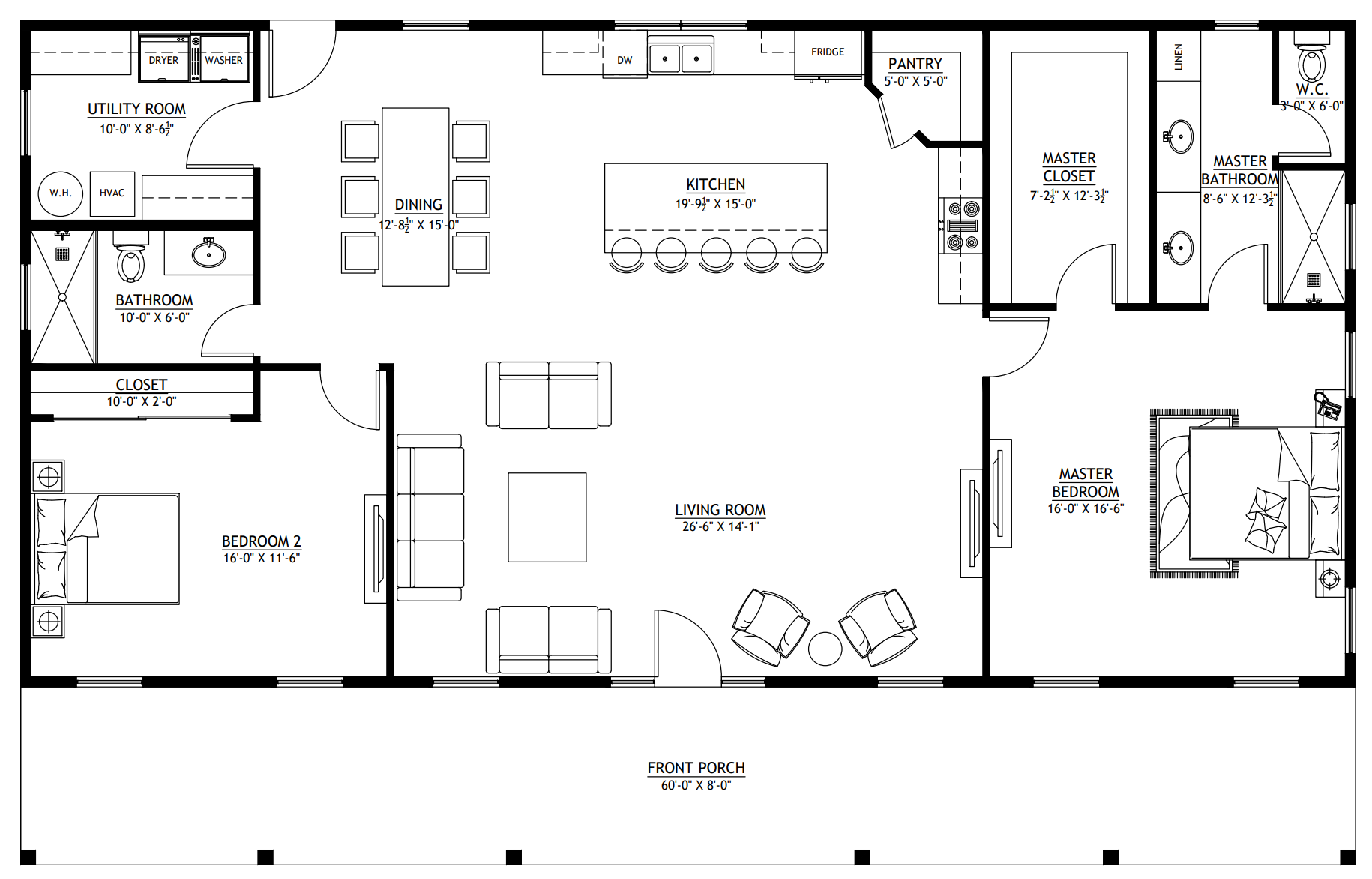 - Additional features include a large Pantry (5'-0" x 5'-0") and a full-width Front Porch (60'-0" x 8'-0").