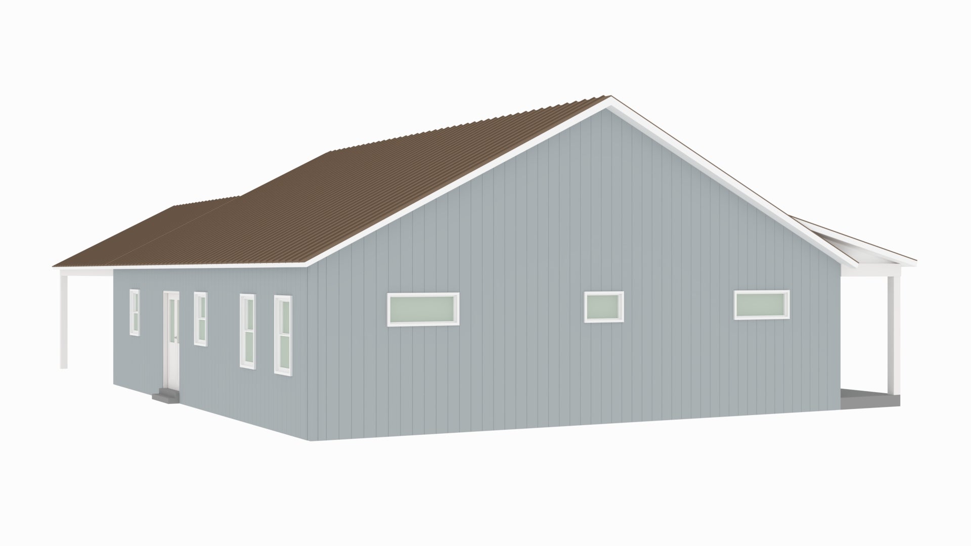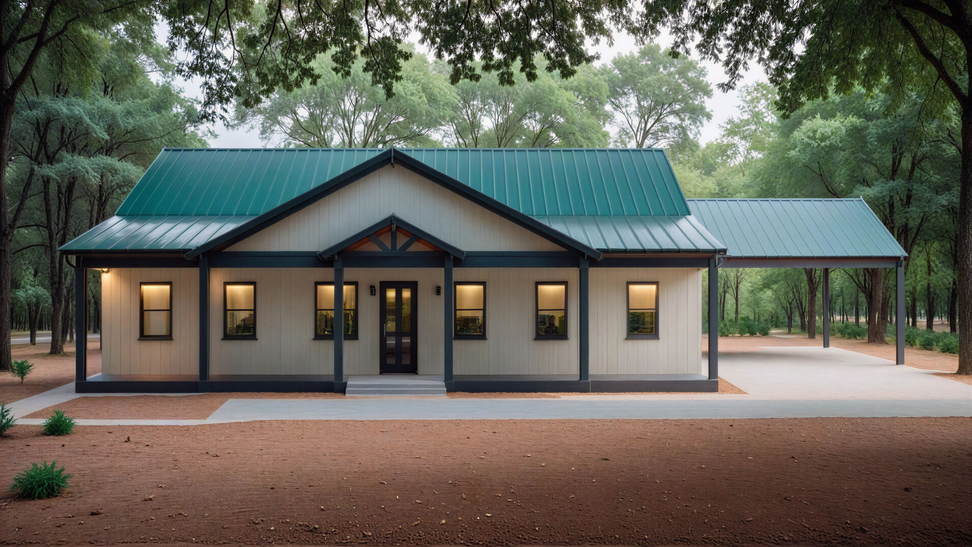 - Convenient carport offering covered parking while maintaining a clean, open barndominium design.