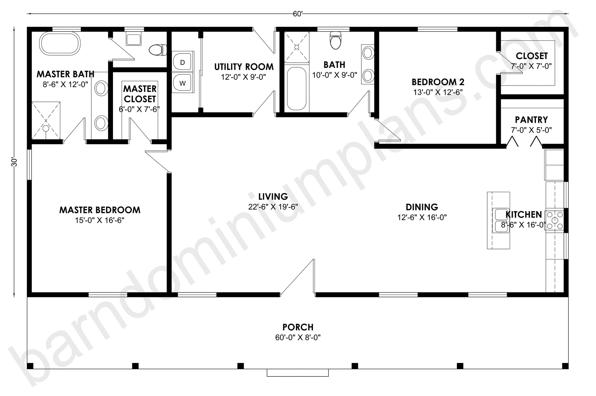 - This two-bedroom, two-bath plan measures 60'-0" x 30'-0" overall.