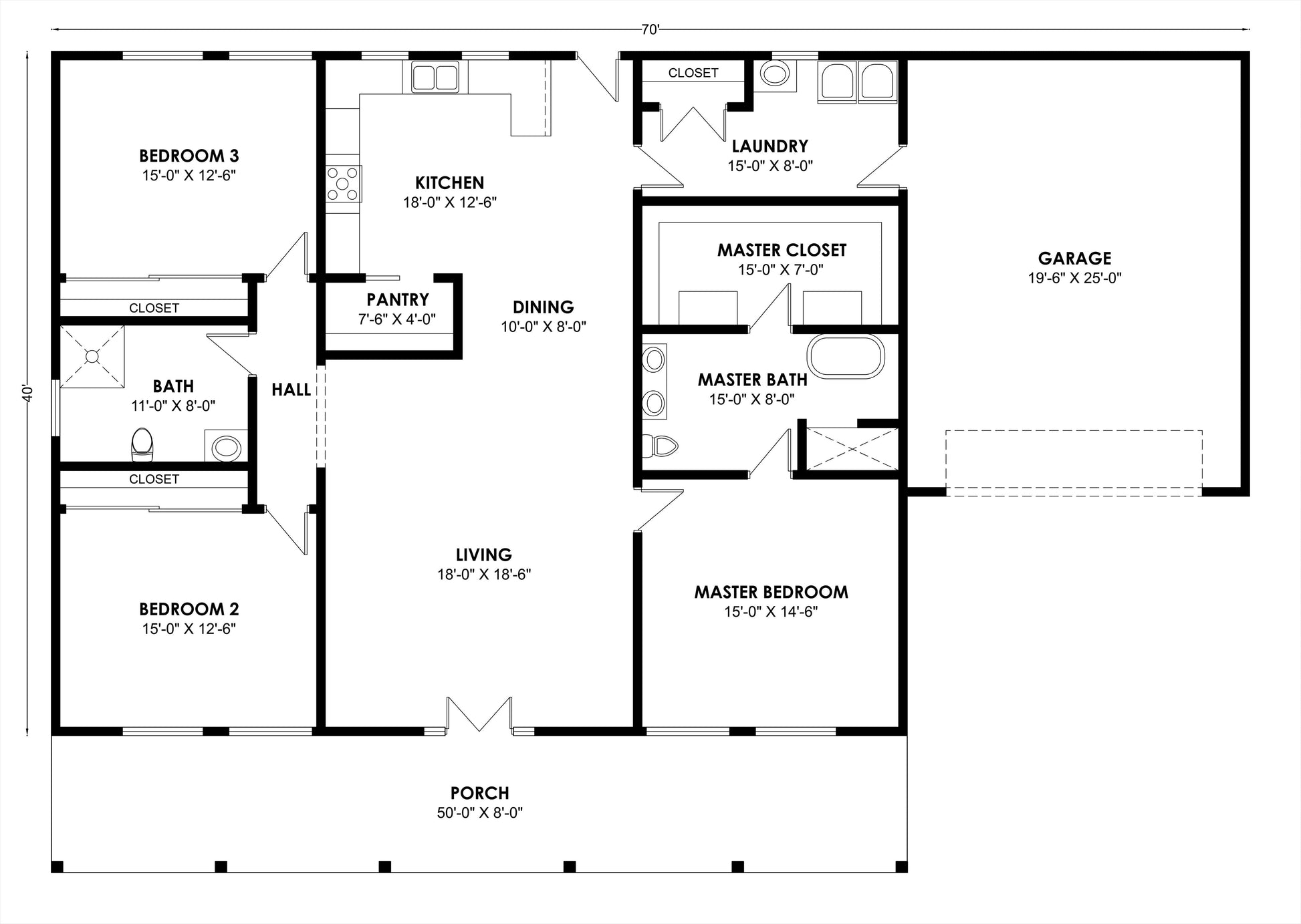 - This three-bedroom, two-bath plan measures 70'-0" x 40'-0" overall (including the attached garage).