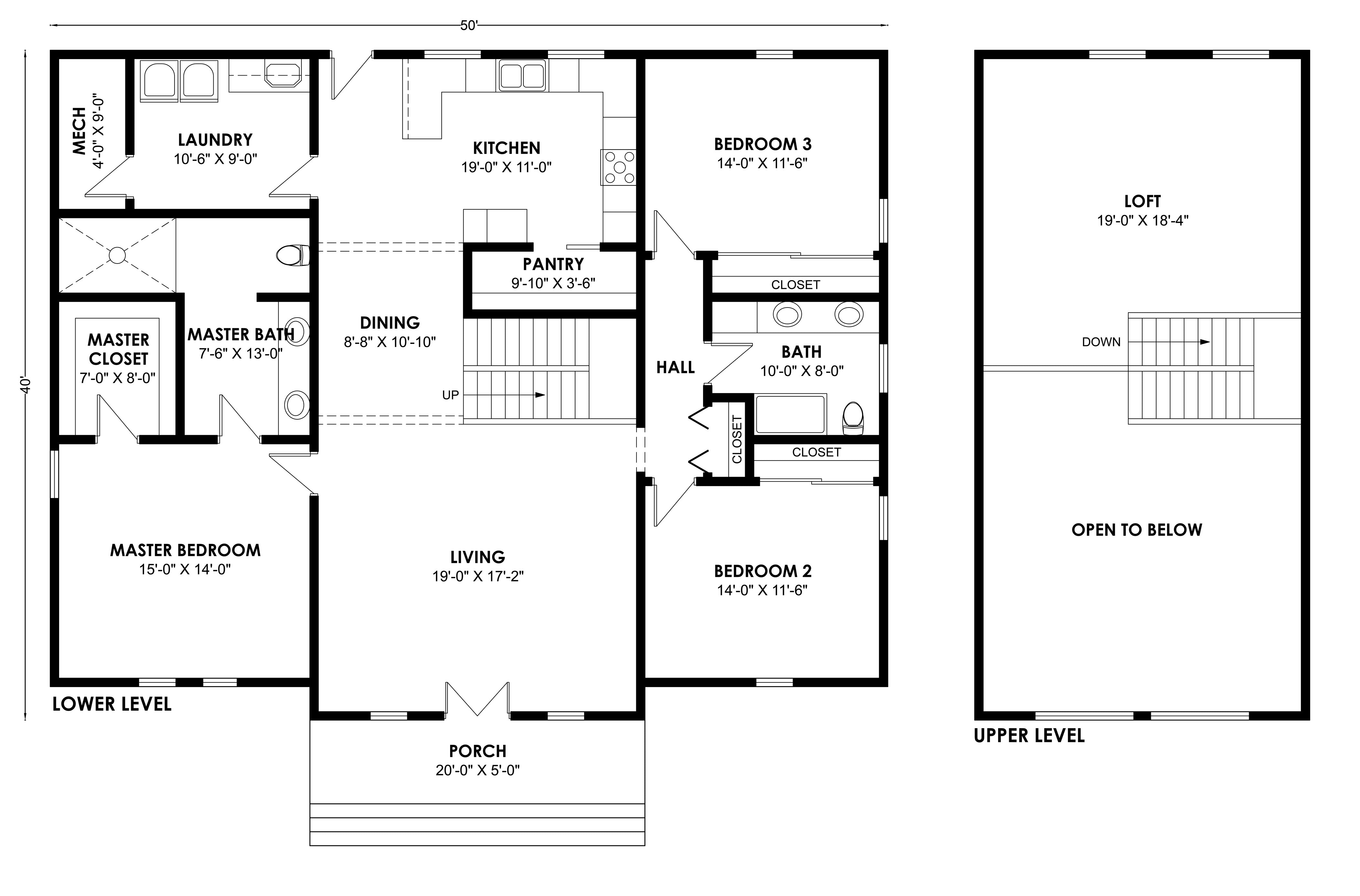 - This three-bedroom, multi-level plan has a total width of 50'-0" and a depth of 40'-0".