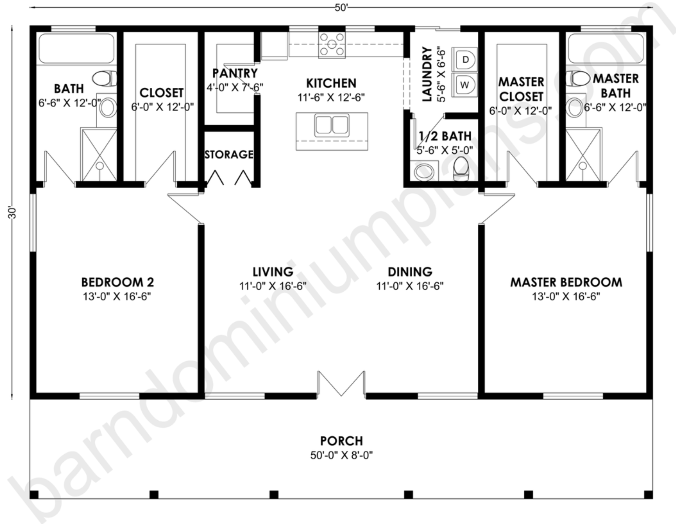 - This efficient single-story barndominium layout offers 1,500 sq. ft. of living space within a compact 50' x 30' footprint.