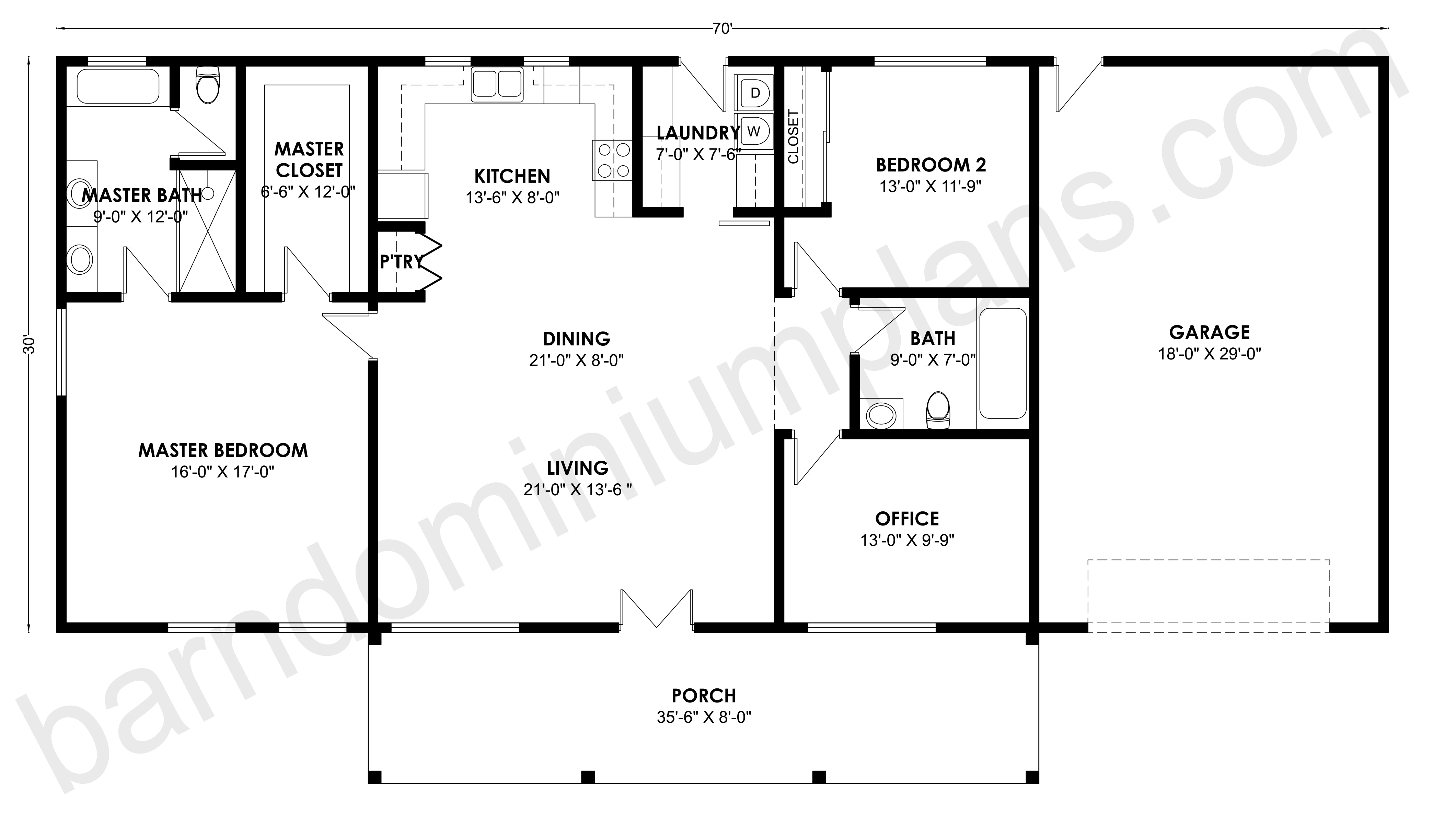 For more barndominium floor plans, check out our complete collection of 2-bedroom barndominium floor plans.