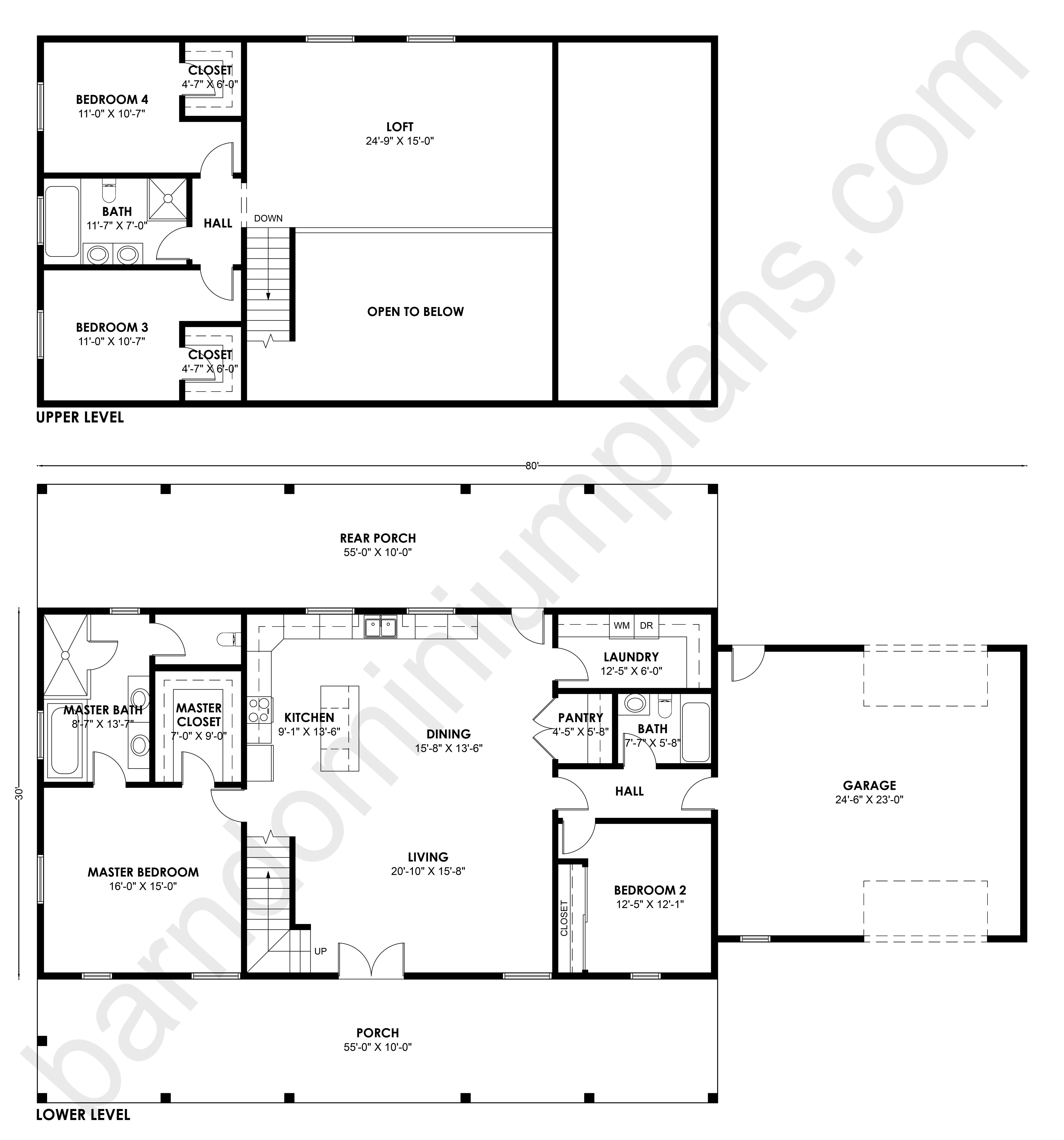 - The Upper Level adds two more Bedrooms (Bedroom 3 at 11'-0" x 10'-7" and Bedroom 4 at 11'-0" x 10'-7") and a Loft (24'-0" x 15'-0") that overlooks the level below.