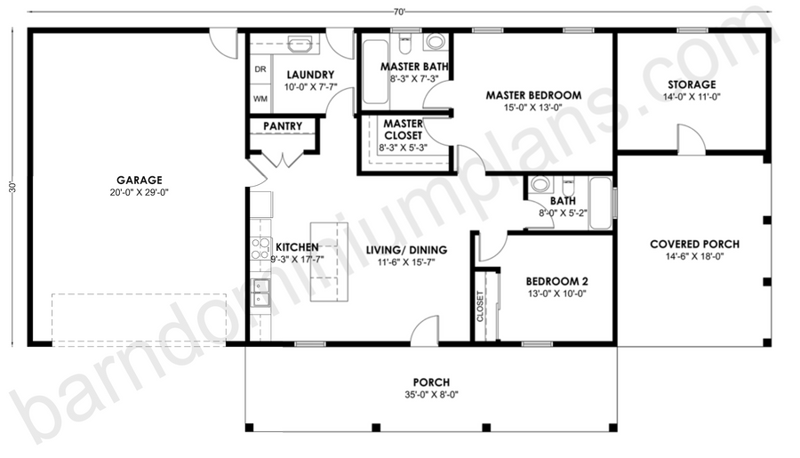 For more barndominium floor plans, check out our complete collection of 2-bedroom barndominium floor plans.