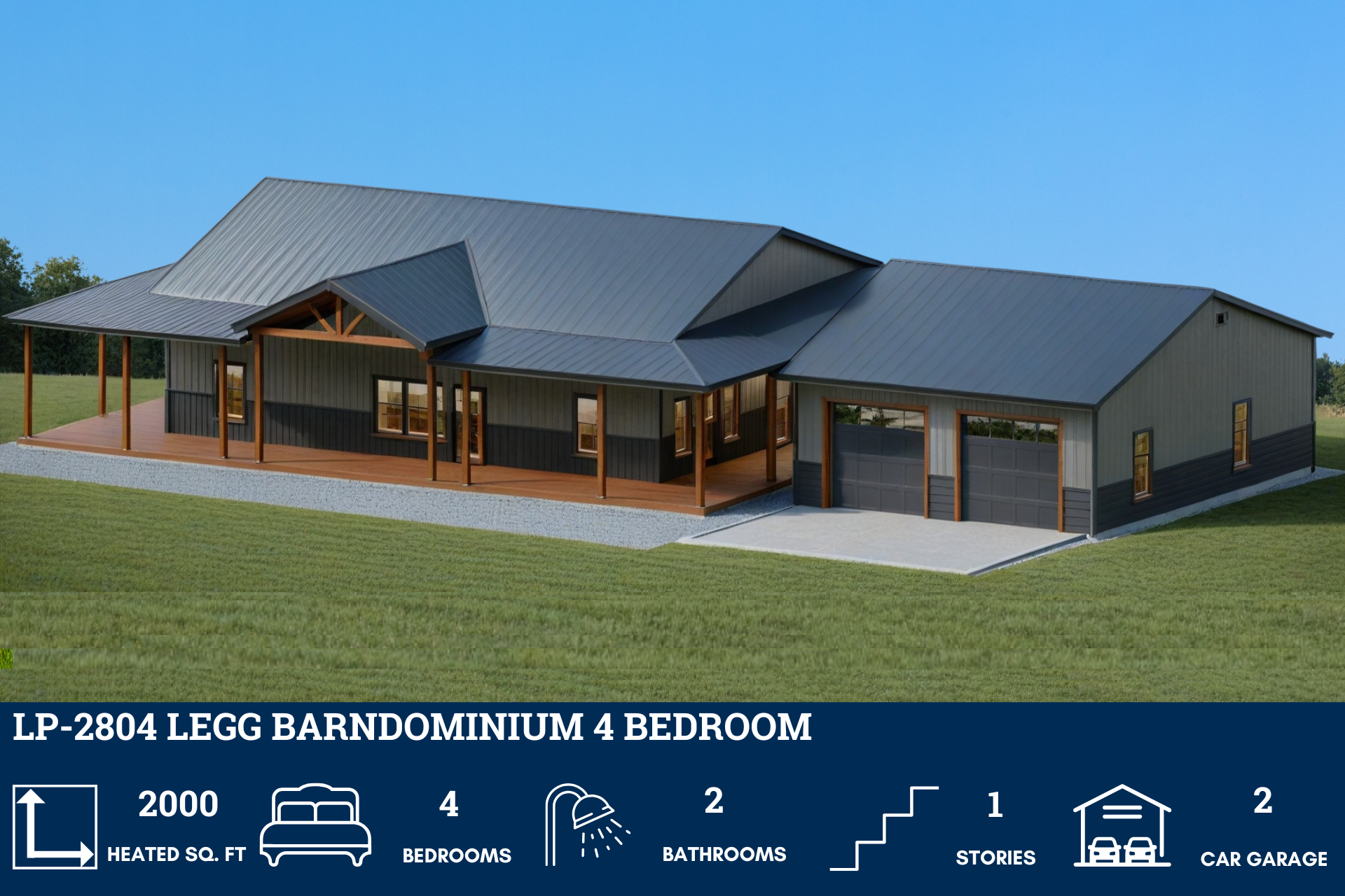- The Legg Barndominium house plan is 2000 heated square feet and features 4 bedrooms and 2 bathrooms.