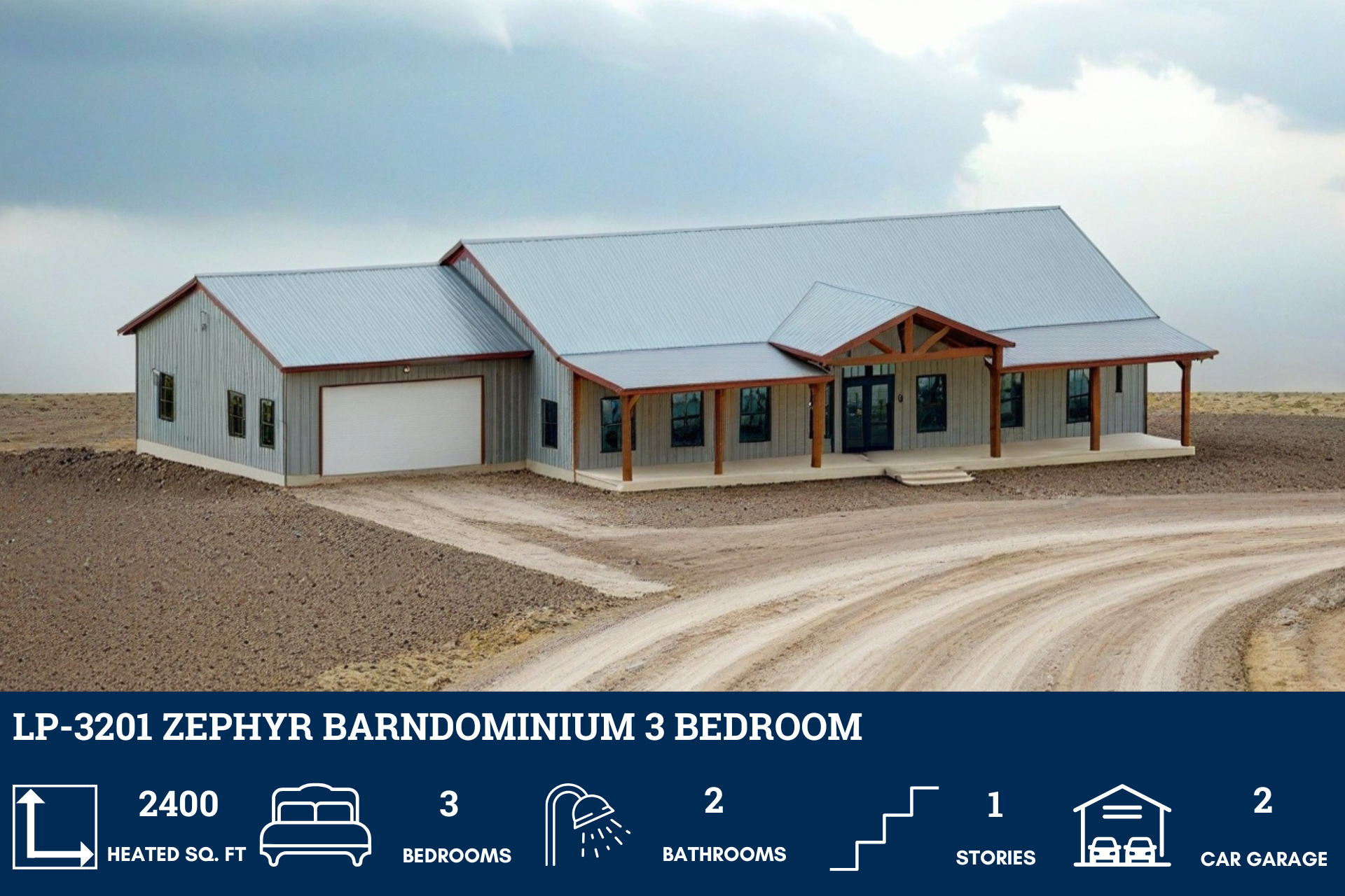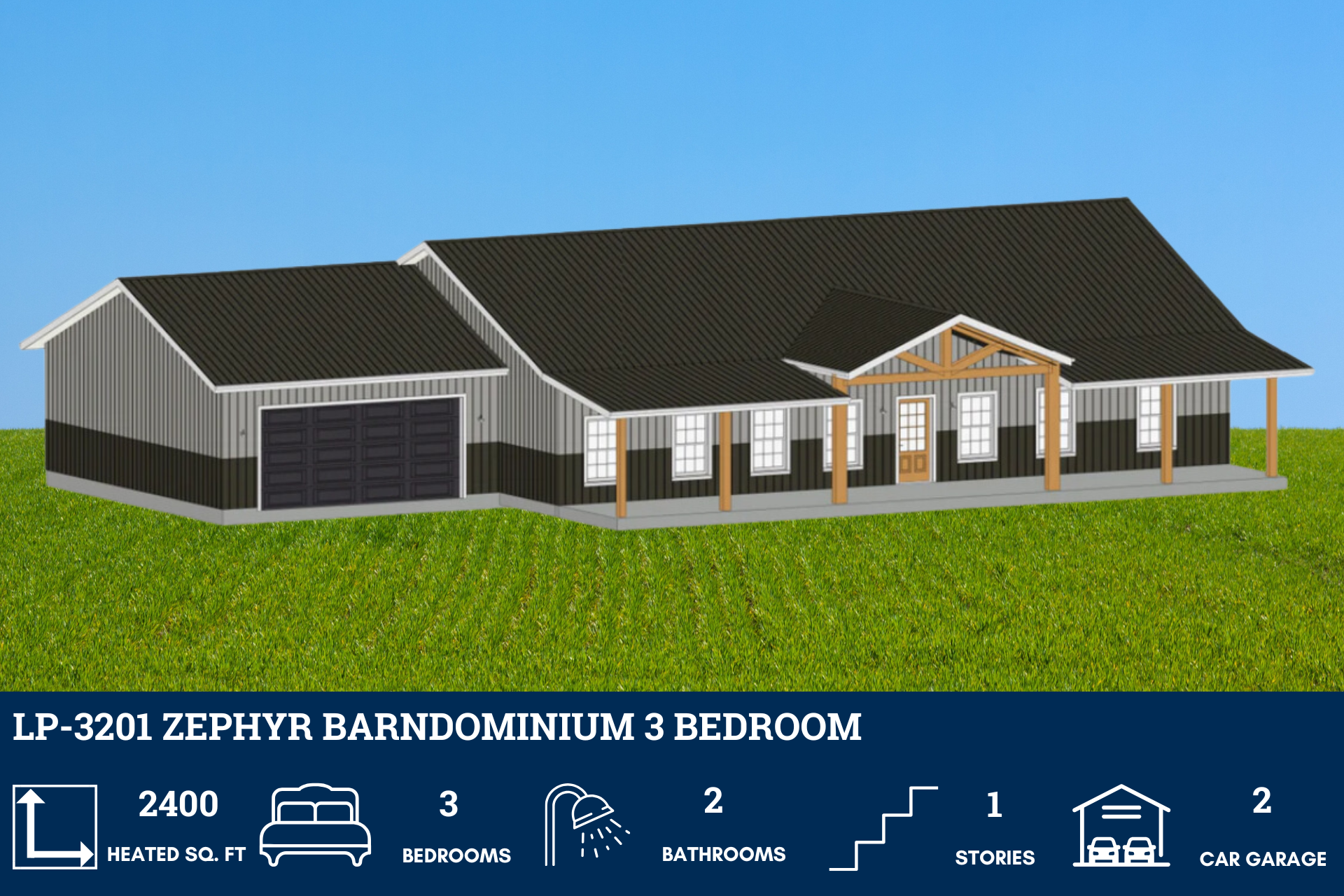 - The Zephyr barndominium house plan is 2400 heated square feet and features 3 bedrooms and 2 bathrooms with an attached 750 square foot attached garage.