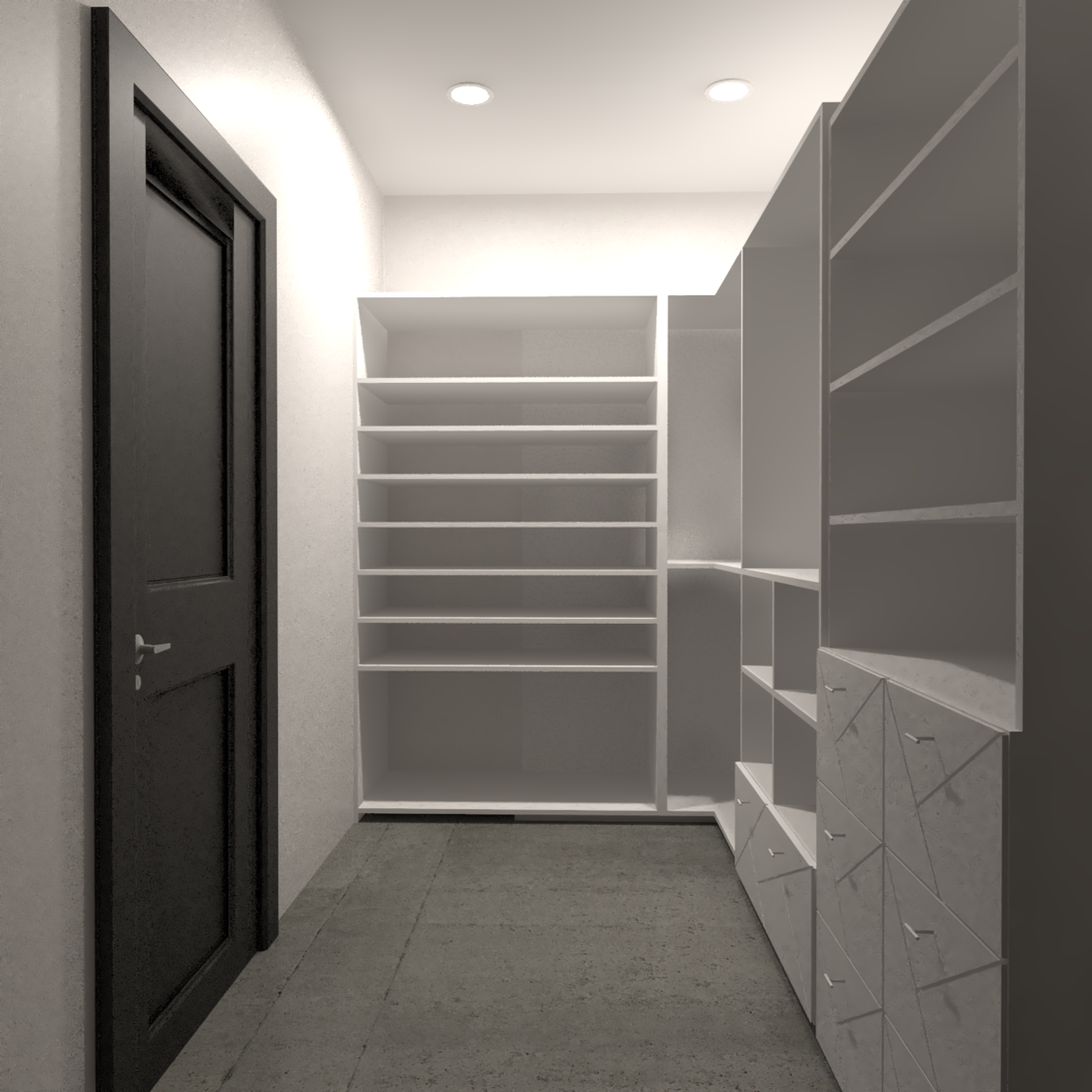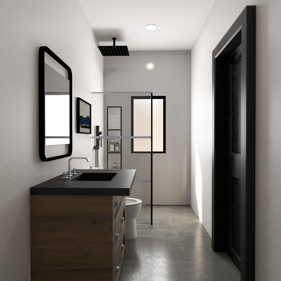 - The plan features two spacious bedrooms, each with its own walk-in closet and private bathroom. The half bathroom conveniently serves guests.