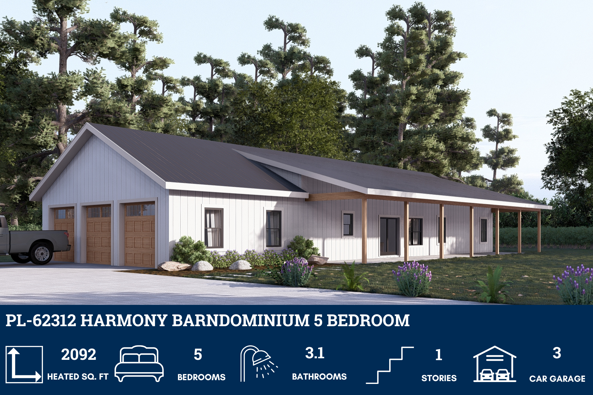 - The Harmony barndominium house plan is 2091 heated square feet and features 5 bedrooms, 3 full bathrooms, 1 1/2 bathroom, and an attached 739 square foot attached garage.