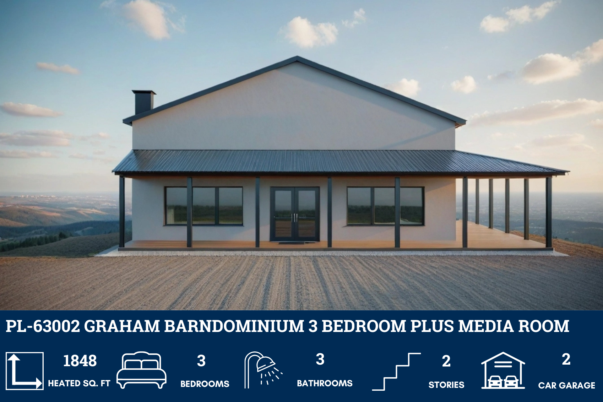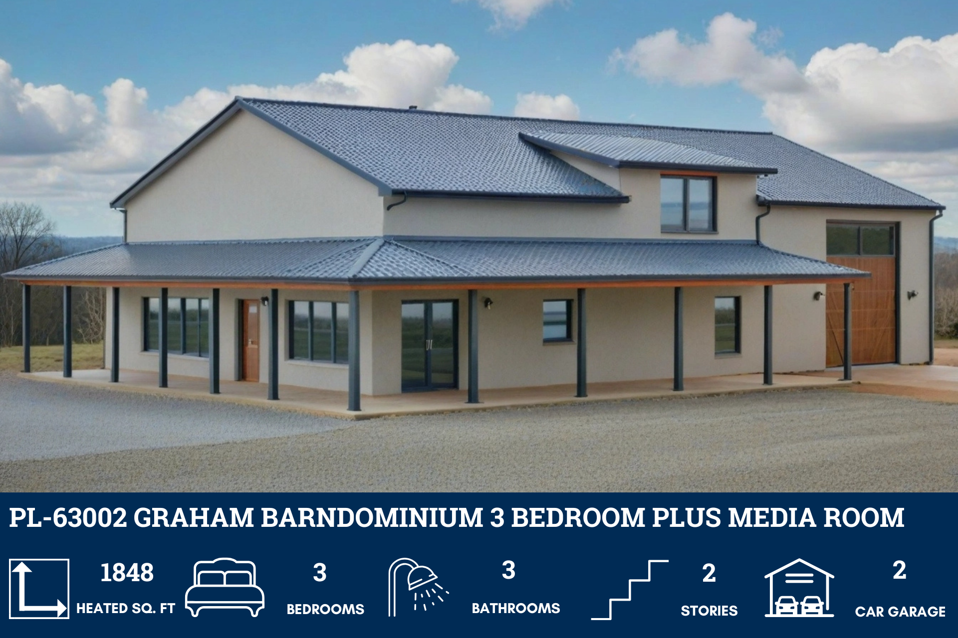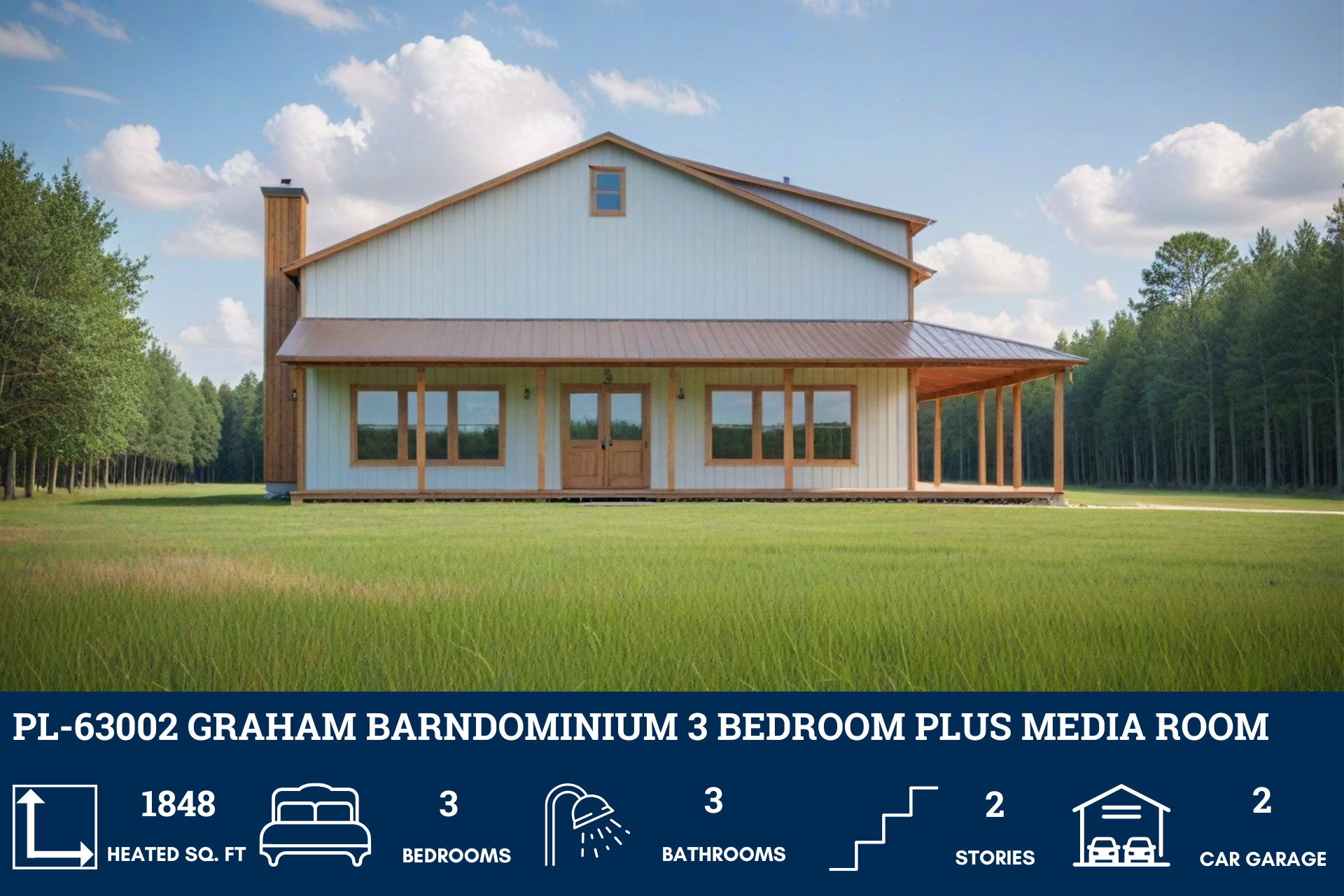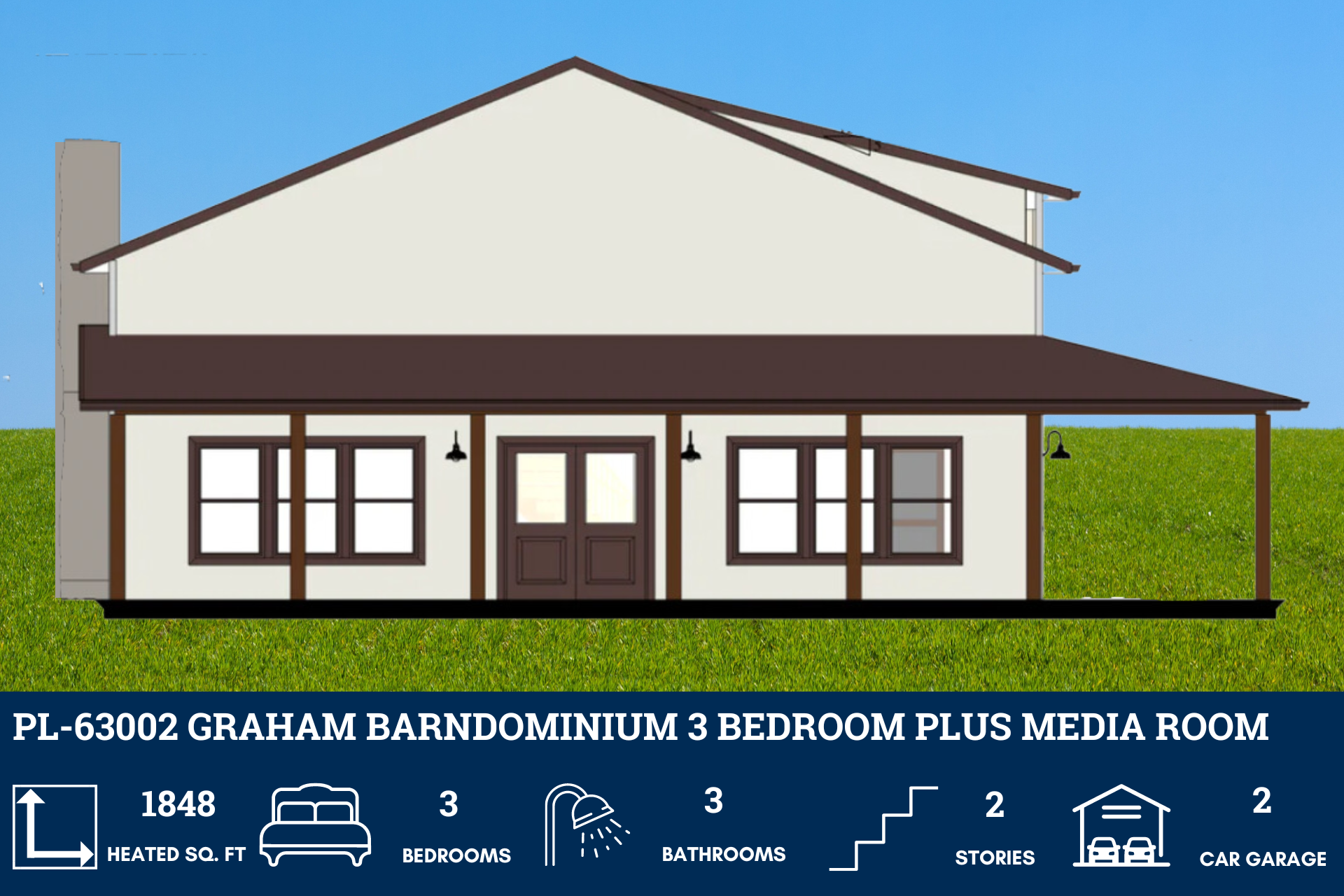 - The Graham barndominium house plan is 1848 heated square feet and features 3 bedrooms, and 3 full bathrooms, with an attached 778 square foot garage.
