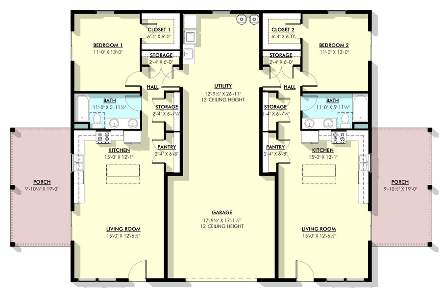 - Spanning 1610 heated square feet, this single-story design offers a distinctive layout with a garage and a spacious utility room at its heart. Flanking this central area are identical living spaces.