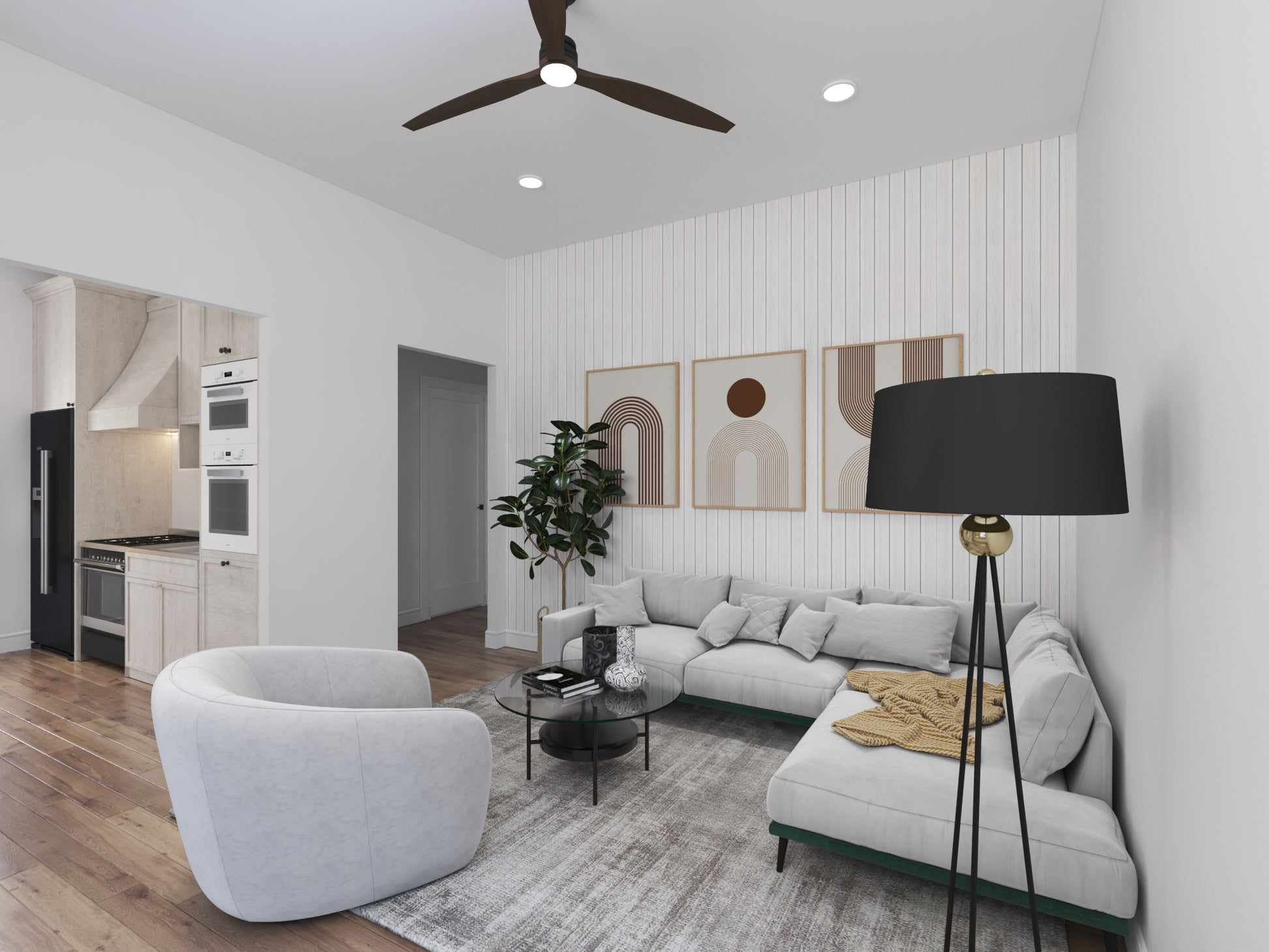 - The living room is positioned near Bedrooms 2, 3, and 4 on the left side and offers a comfortable area for relaxation and family time and the adjacent secondary kitchen is ideal for additional cooking needs.