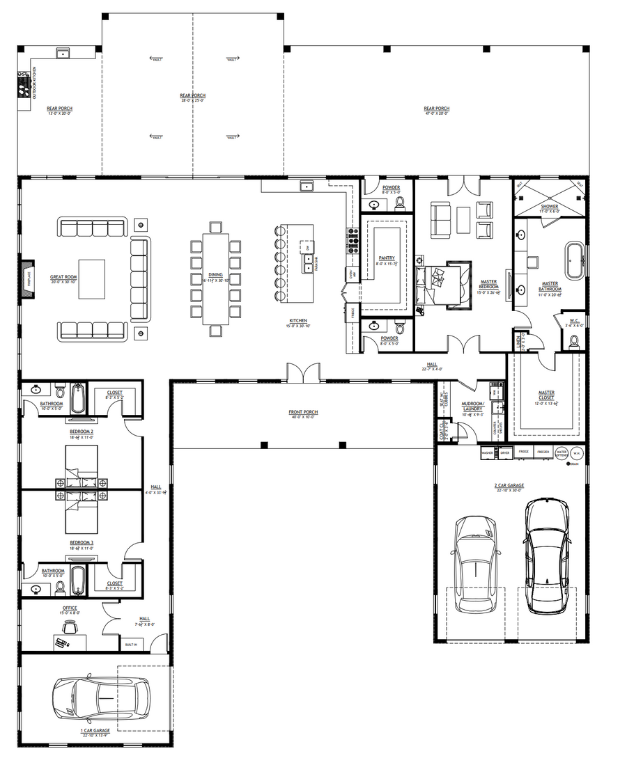 1-car garage 355 SF, 2-car garage: 745 SF, Porches 2,300 SF TOTAL = 3,400 SF