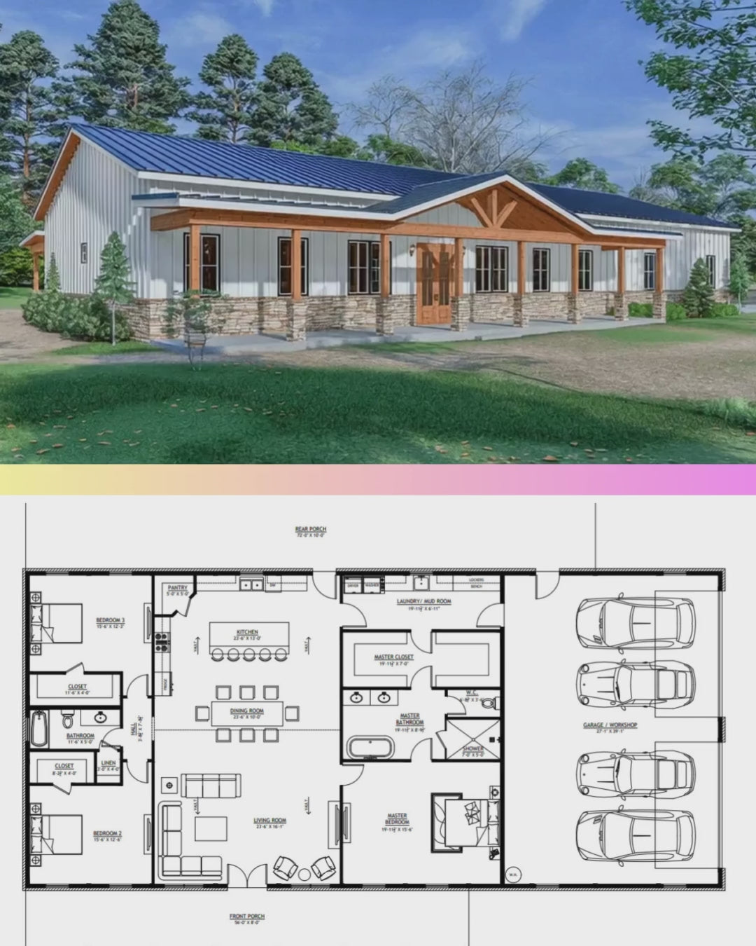 For more barndominium floor plans, check out our complete collection of 3-bedroom barndominium floor plans.