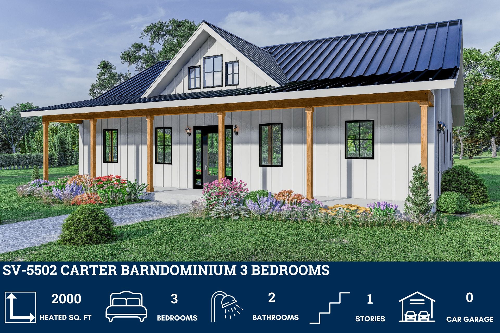 - Discover the charm of country living with this 2000 square foot barndominium floor plan. This single-story haven offers three spacious bedrooms and two full bathrooms.